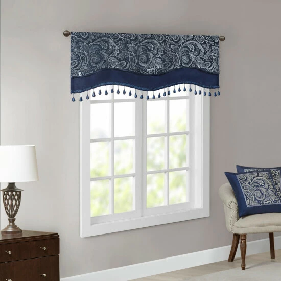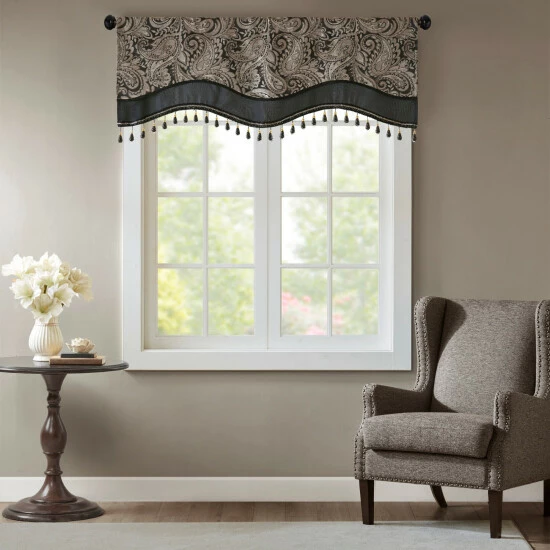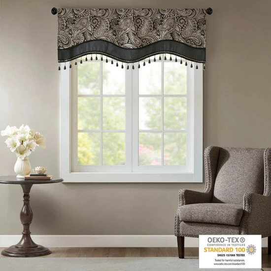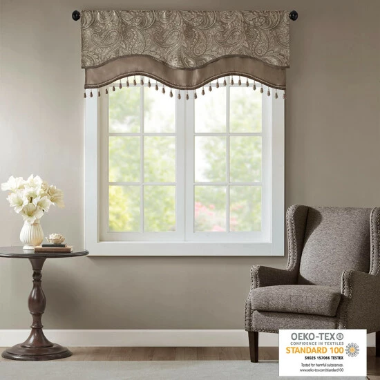 For a unique and luxuriously classic style, our Madison Park Wellington Beaded Valance is the perfect extra touch to your decor. The alluring jacquard weave is inspired from an updated paisley motif and is woven in beautiful hues of burnt colorful, and a hint of silver for a shimmering accent. The window valance features solid faux silk piecing and flat piping details, while delicately finished with a scalloped bottom design and intricate gold bead trim, creating an intriguing elegant look. This window panel is also OEKO-TEX certified, meaning it does not contain any harmful substances or chemicals, ensuring quality comfort and wellness. Simply hang on rod pocket; fits up to a 1.25 diameter rod.
